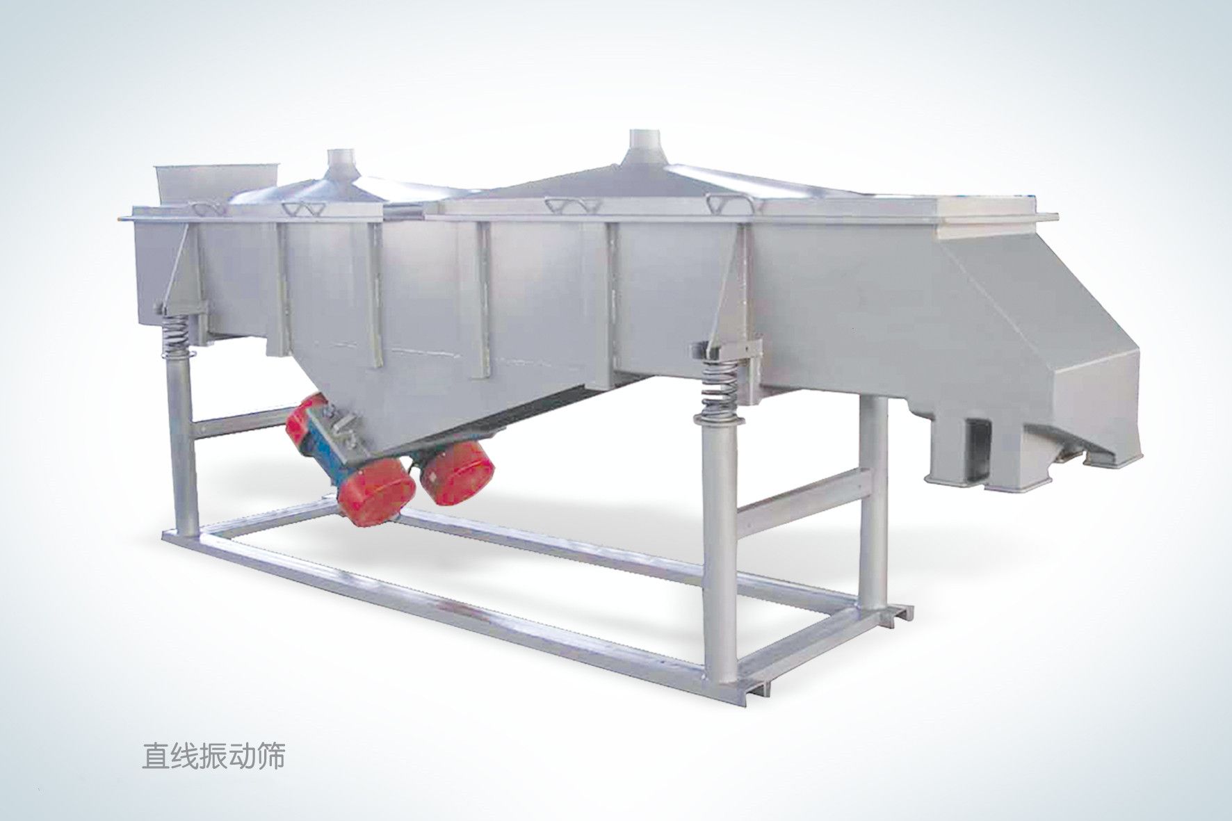 直線(xiàn)振動(dòng)篩由篩箱、振動(dòng)器、支撐彈簧、隔振架、二次隔振彈簧、電動(dòng)機及支架等構成;篩箱部件由篩框、上下層篩面及緊固裝置構成;篩框側板用整塊優(yōu)質(zhì)鋼板造,側板加強筋板和橫梁、振動(dòng)器底座間滴鏈接選用高強度螺栓與自鎖式螺母或環(huán)槽鉚釘鏈接,牢固可靠;振動(dòng)器一般裝在篩框上部滴兩邊側板上,同一串振動(dòng)器間選用萬(wàn)向聯(lián)軸器鏈接;振動(dòng)器選用迷宮式密封,脂油潤滑;電動(dòng)機裝在固定支架上,用萬(wàn)向聯(lián)軸器與振動(dòng)器鏈接。